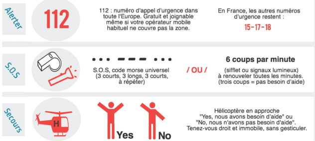 Signal S.O.S : Il est aussi important de savoir faire un signal de S.O.S avec votre torche ou un sifflet. Ce signal peut se faire de deux façons. En code morse, le S.O.S se fait avec trois signaux courts, suivi de trois signaux longs et finir avec trois autres signaux courts. Ce signal d’alerte peut se faire aussi avec 6 coups par minutes à répéter toutes les minutes.