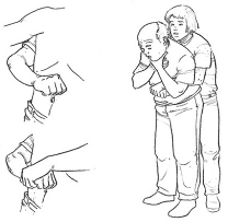 Petit rappel : Pour effectuer une compression abdominale, placez-vous derrière la victime. Entourez cette dernière de vos bars au niveau du nombril. Compressez ensuite la victime pour que celle-ci éjecte l’aliment bloquer.