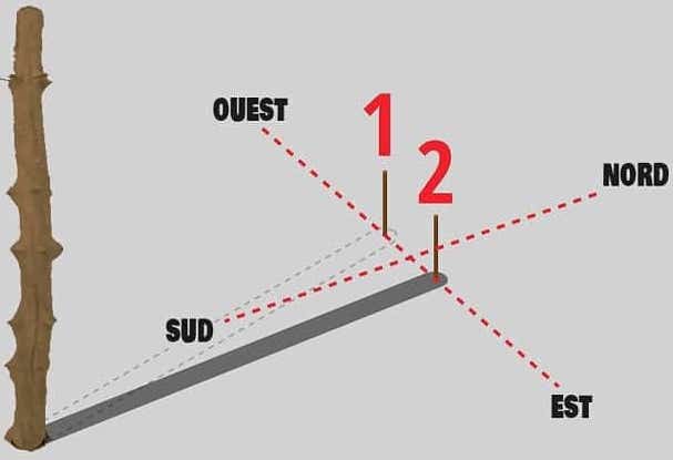 Petit rappel : Pour savoir où se trouve les différents points cardinaux, il faut savoir où se lève le soleil et observer son déplacement. Le soleil se lève à l’Est et se couche à l’Ouest. Ainsi, vous pourrez déterminer à quel point cardinal correspond chacun de vos bâtons.